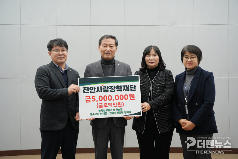 이번 장학금은 지난 1월 7일 자로 사무관으로 승진한 한소영 농축산유통과장과 이세민 성수면장, 정애경 건강증진과장이 뜻을 모아 마련했다.