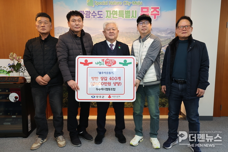 무주군은 무주택시협동조합이 지난 1월 30일 방한 장갑 400세트(약 600만 원 상당)를 기탁했다고 밝혔다. 이번 기탁은 조합원 7명이 뜻을 모아 마련한 것으로, 추운 겨울철 어르신들의 건강과 안전을 바라는 마음이 담겼다.