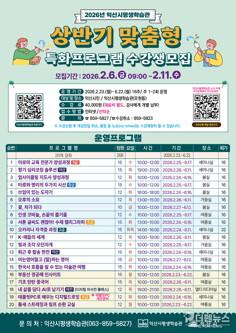 익산시는 3일 익산시평생학습관에서 ‘2026년 상반기 맞춤형 특화프로그램’ 수강생을 오는 6일부터 선착순으로 모집한다고 밝혔다. 프로그램은 2월 23일 개강해 6월 22일까지 16주간 운영된다.