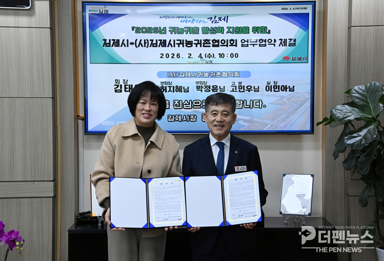 정성주 김제시장은 “이번 협약은 귀농귀촌 정책을 보다 전문적이고 체계적으로 추진하기 위한 중요한 계기”라며 “김제에서 새로운 삶을 시작하는 귀농·귀촌인이 안정적으로 정착할 수 있도록 지속적인 지원과 정주 여건 개선에 힘쓰겠다”고 밝혔다.