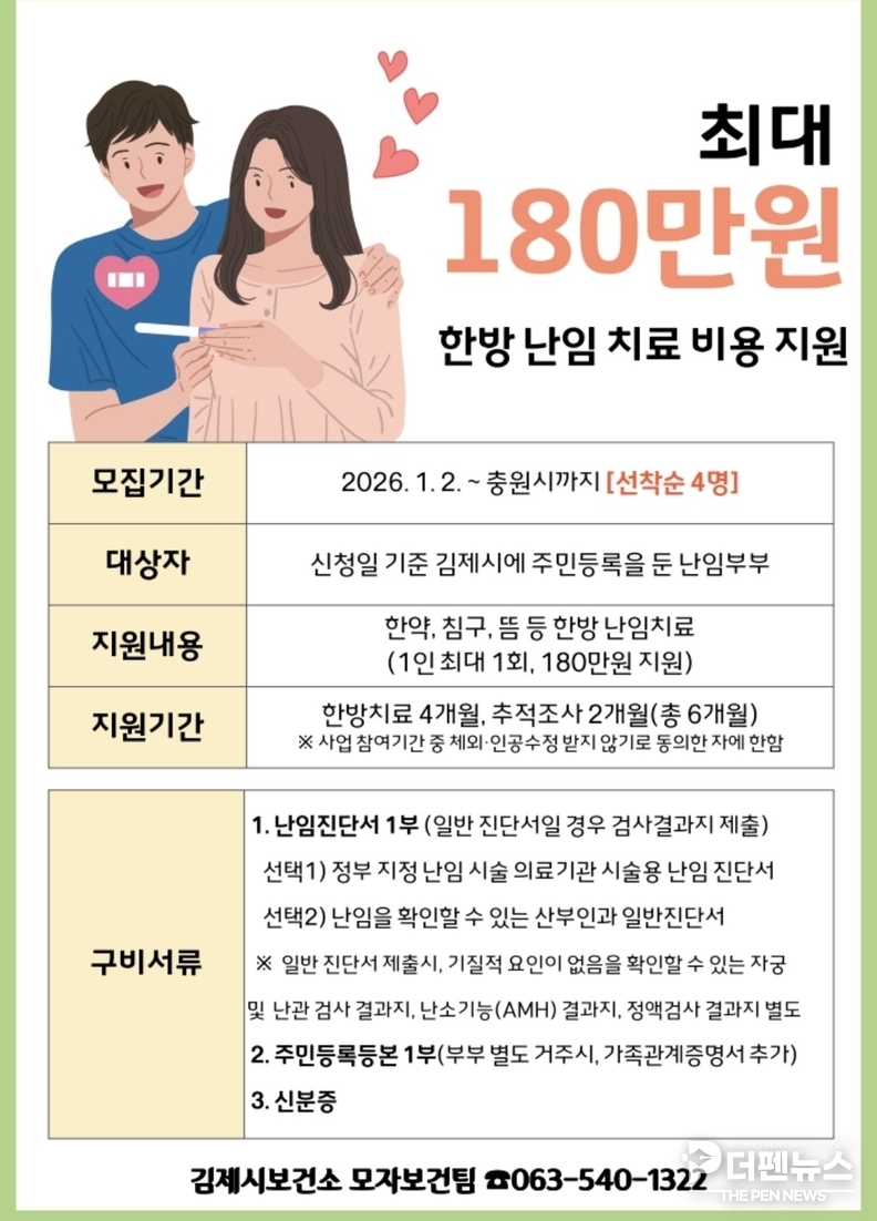 김제시가 난임으로 어려움을 겪는 부부의 임신과 출산을 돕기 위해 2026년 한방 난임부부 지원사업을 추진한다.