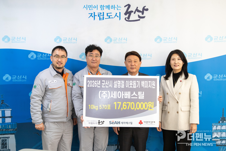 군산시 관계자는 “매년 변함없이 나눔을 실천해 주시는 세아베스틸에 깊이 감사드린다”며 “이번 기탁이 설 명절을 앞두고 어려운 이웃들에게 큰 힘이 되길 바란다”고 말했다.