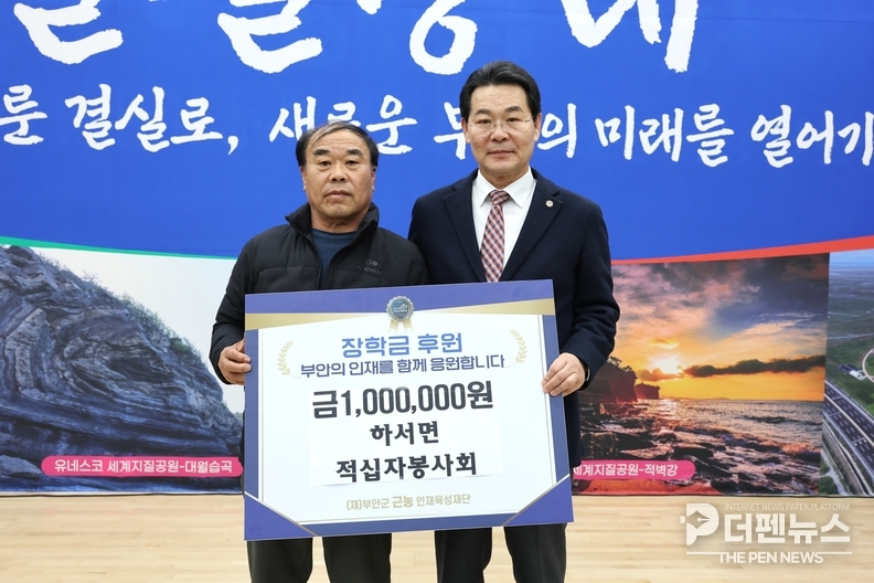 부안군은 하서면 문화센터에서 열린 ‘2026년 군민과의 희망소통대화’ 행사에서 하서면 적십자봉사회와 하서면체육회가 부안군근농인재육성재단에 각각 장학금 100만 원을 기탁했다고 밝혔다.
