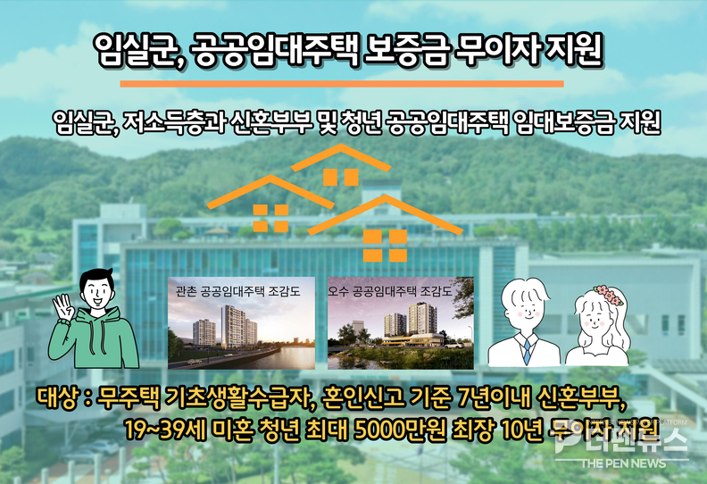 10일 임실군에 따르면 관내 공공임대주택 입주 예정자를 대상으로 ‘공공임대주택 임대보증금 지원사업’을 실시, 가구당 최대 5,000만 원을 무이자로 지원한다고 밝혔다.
