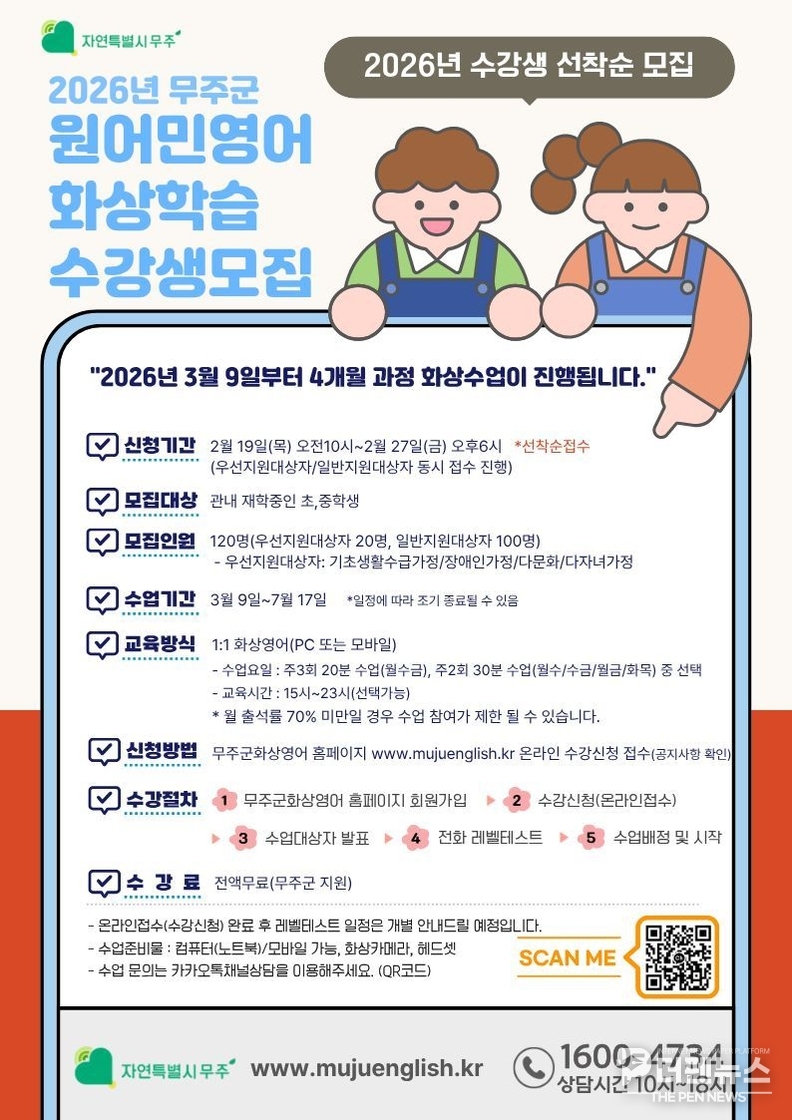 우선지원대상자는 기초생활수급 가정, 장애인 가정, 다문화 가정, 2자녀 이상 다자녀 가정의 학생이다. 신청은 무주군 화상영어 누리집을 통해 온라인으로 하면 된다.