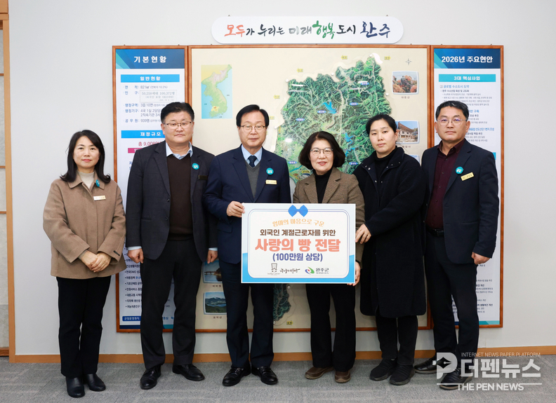 완주군은 지난 13일 군수실에서 ‘사랑의 빵’ 전달식을 열고 외국인 계절근로자들에게 쌀빵 꾸러미 190명분을 전달했다고 19일 밝혔다.