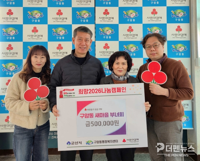 구암동 새마을부녀회는 23일 구암동 행정복지센터를 찾아 성금 50만원을 기탁했다고 밝혔다. 성금은 전북사회복지공동모금회를 통해 저소득 가구와 복지 사각지대 위기가구 지원에 사용될 예정이다.