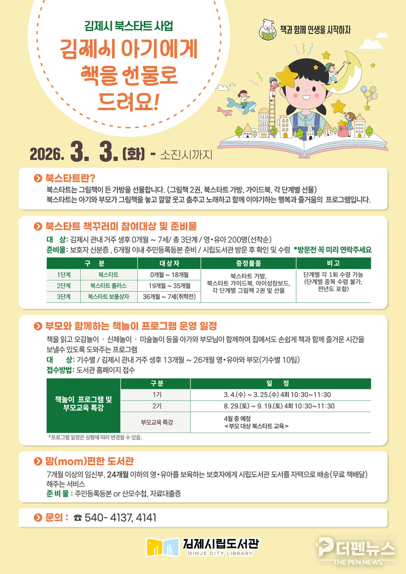 김제시립도서관은 영·유아의 독서 습관 형성을 돕기 위한 2026년 북스타트 책꾸러미 배부 사업을 오는 3월 3일부터 운영한다고 25일 밝혔다.