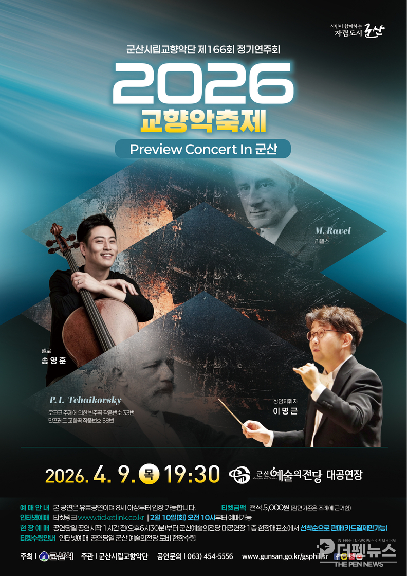 연주회는 모리스 라벨의 ‘라 발스’로 문을 연다. 이어 첼리스트 송영훈이 협연자로 나서 차이콥스키의 ‘로코코 주제에 의한 변주곡’을 들려준다. 마지막 무대에서는 군산시립교향악단이 창단 이후 처음 도전하는 차이콥스키 ‘만프레드 교향곡(Op.58)’이 연주된다.