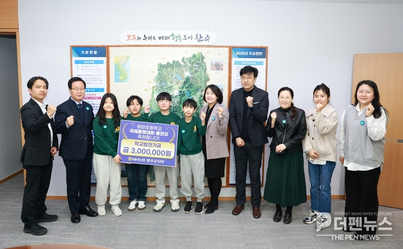 완주군은 26일 군청에서 NH농협 완주군지부가 봉동읍 청완초등학교 ‘에버그린(EVERGREEN)’팀에 격려금 300만원을 전달했다고 밝혔다. 전달식에는 유희태 완주군수와 농협 관계자, 학생, 학부모, 지도 교사가 참석했다.