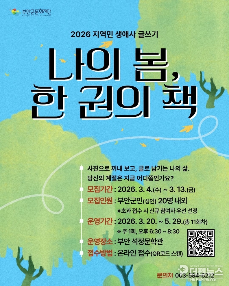 재단은 2026년 지역민 생애사 기록 프로그램 ‘나의 봄, 한 권의 책’ 참여자를 모집한다고 밝혔다. 단순한 에세이 창작을 넘어 참여자의 생애 전반을 시기별로 정리하는 ‘생애사 기록’에 초점을 맞춘 과정이다.