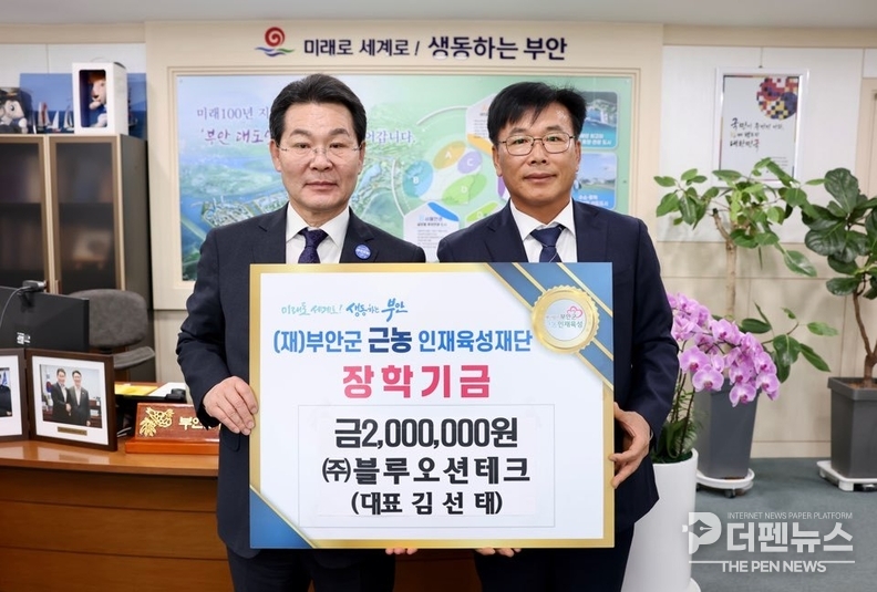 부안군 근농인재육성재단은 블루오션테크가 지난 25일 장학금 200만원을 기탁했다고 밝혔다. 기업의 사회적 책임 실천과 지역사회 상생 차원에서 이뤄진 기부다.