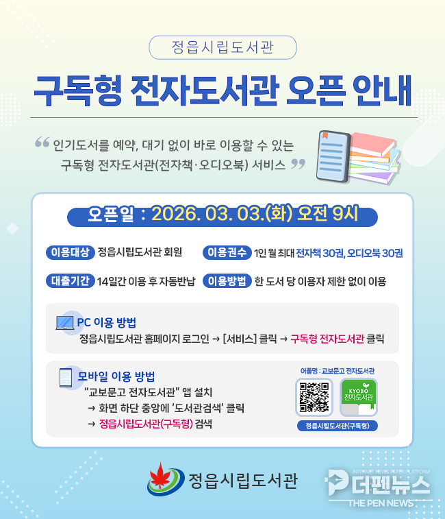 정읍시가 스마트폰 하나로 최신 베스트셀러를 기다림 없이 바로 읽을 수 있는 ‘구독형 전자책’ 시대를 연다. 시는 오는 3월 3일부터 시민들의 독서 접근성을 획기적으로 높인 ‘구독형 전자책 서비스’를 본격 운영한다고 밝혔다.