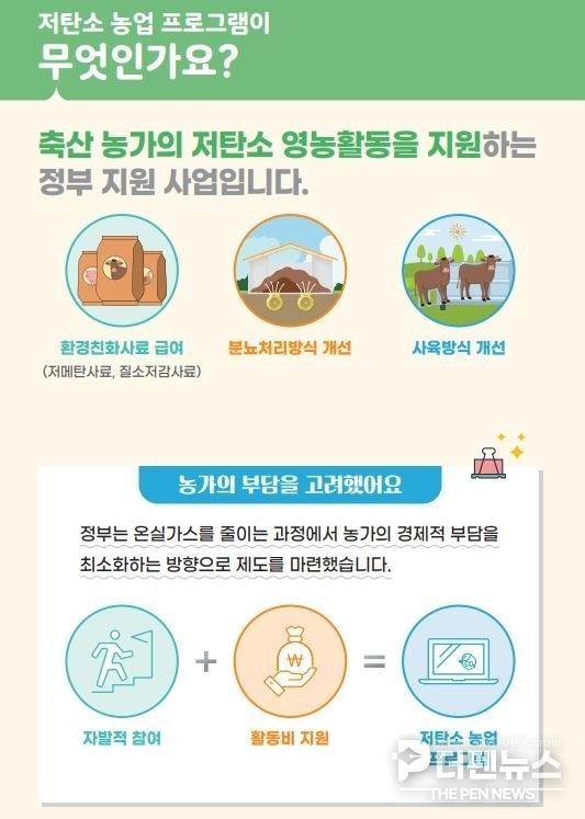 이번 사업은 저메탄·질소저감 사료 급여, 가축 분뇨 처리 개선 등 온실가스 감축 활동을 이행한 농가에 활동비를 지원하는 방식으로 운영된다. 감축 노력에 대한 보상 체계를 마련해 지속 가능한 축산업으로의 전환을 유도한다는 계획이다.