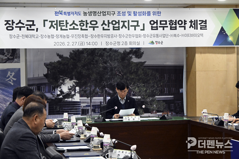 전북 장수군이 ‘저탄소 한우 산업지구’ 조성을 위한 관계기관 협력체계를 공식화하며 축산업 구조 전환에 나섰다. 생산부터 가공·유통까지 전 과정을 아우르는 통합 저탄소 가치사슬을 구축해 지속 가능한 축산 생태계를 만들겠다는 구상이다.