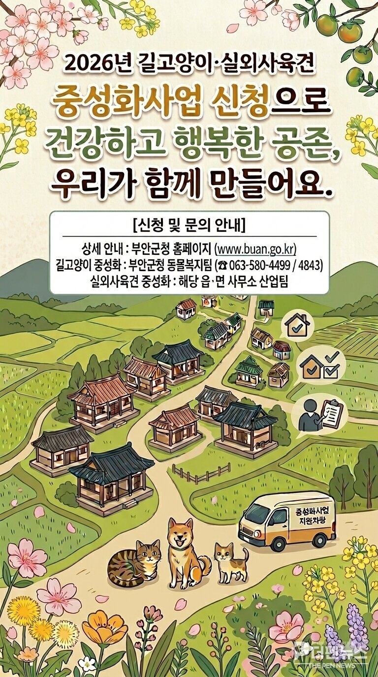 부안군은 2026년 실외사육견과 길고양이를 대상으로 중성화 수술비를 지원한다고 밝혔다. 개체 수 조절을 통해 개물림 사고와 농작물 피해, 발정기 소음 등 각종 민원을 사전에 차단하겠다는 취지다.