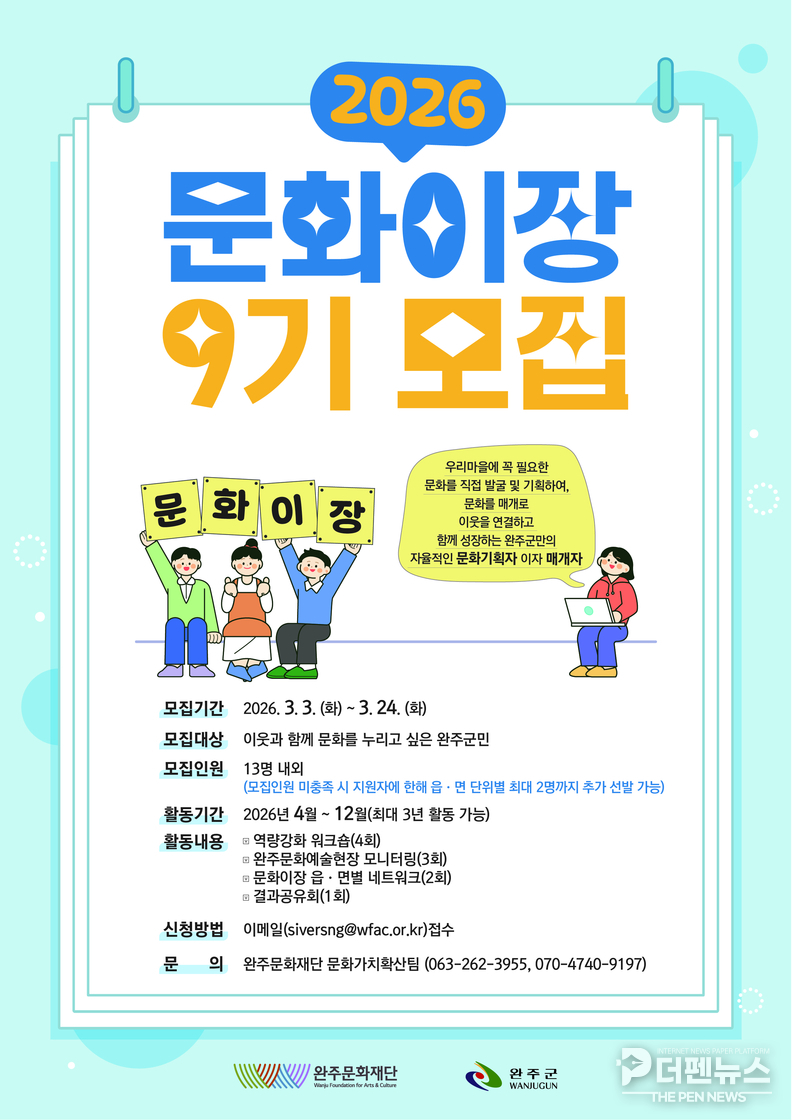 완주문화재단이 지역 문화 활성화를 이끌 ‘2026 문화이장 9기’ 13명을 모집한다.