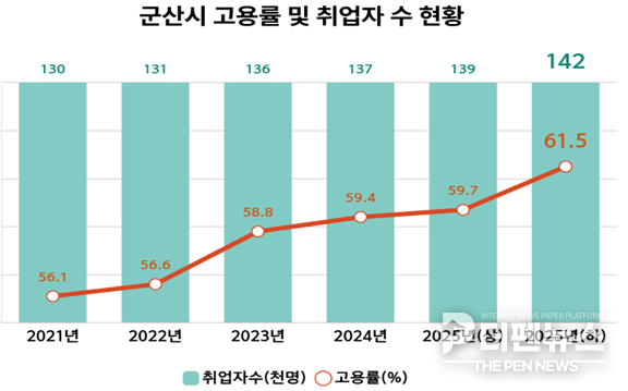 시에 따르면 통계청 국가데이터포털의 ‘지역별 고용조사’ 결과 2025년 하반기 군산시 고용률은 61.5%로 나타나 전년 같은 기간보다 2.1%포인트 상승했다. 취업자 수는 14만2000명으로 지난해 하반기보다 5000명 증가했다.