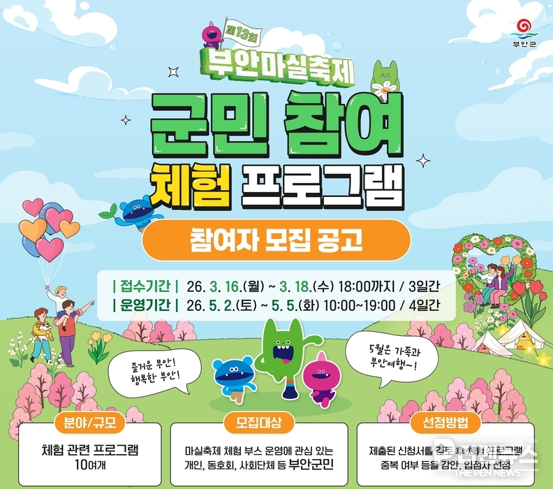 부안군 대표축제추진위원회는 오는 5월 2일부터 5일까지 4일간 해뜰마루 지방정원에서 열리는 제13회 부안마실축제 체험 프로그램 운영자를 공개 모집한다고 밝혔다.