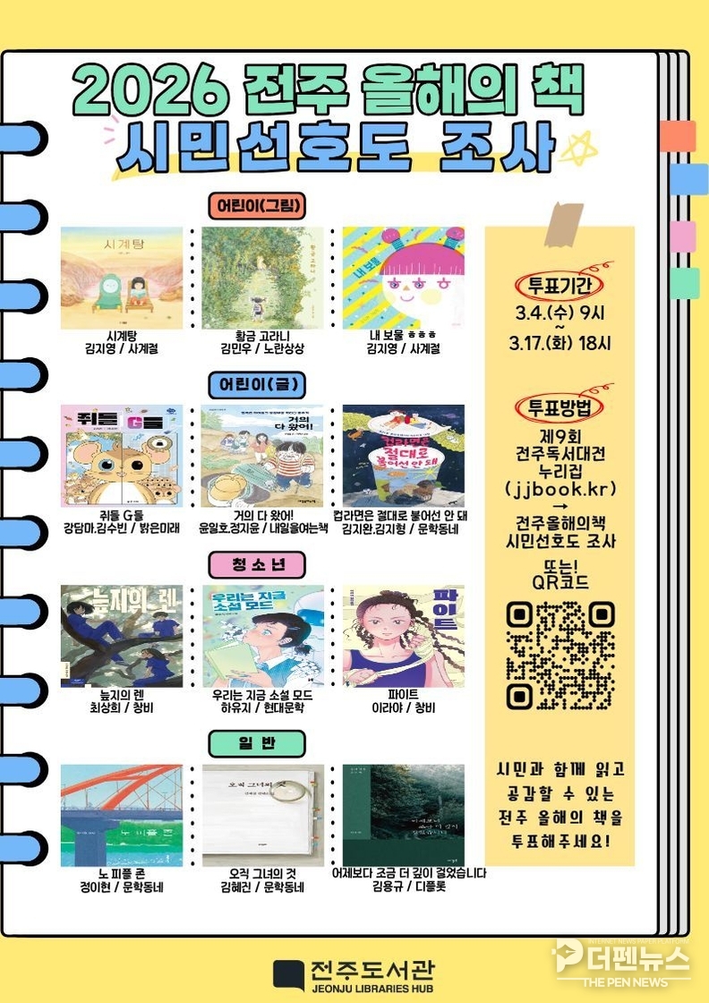 전주시는 오는 17일까지 약 2주간 ‘2026 전주 올해의 책’ 최종 선정을 위한 온라인 시민 선호도 조사를 진행한다고 4일 밝혔다.