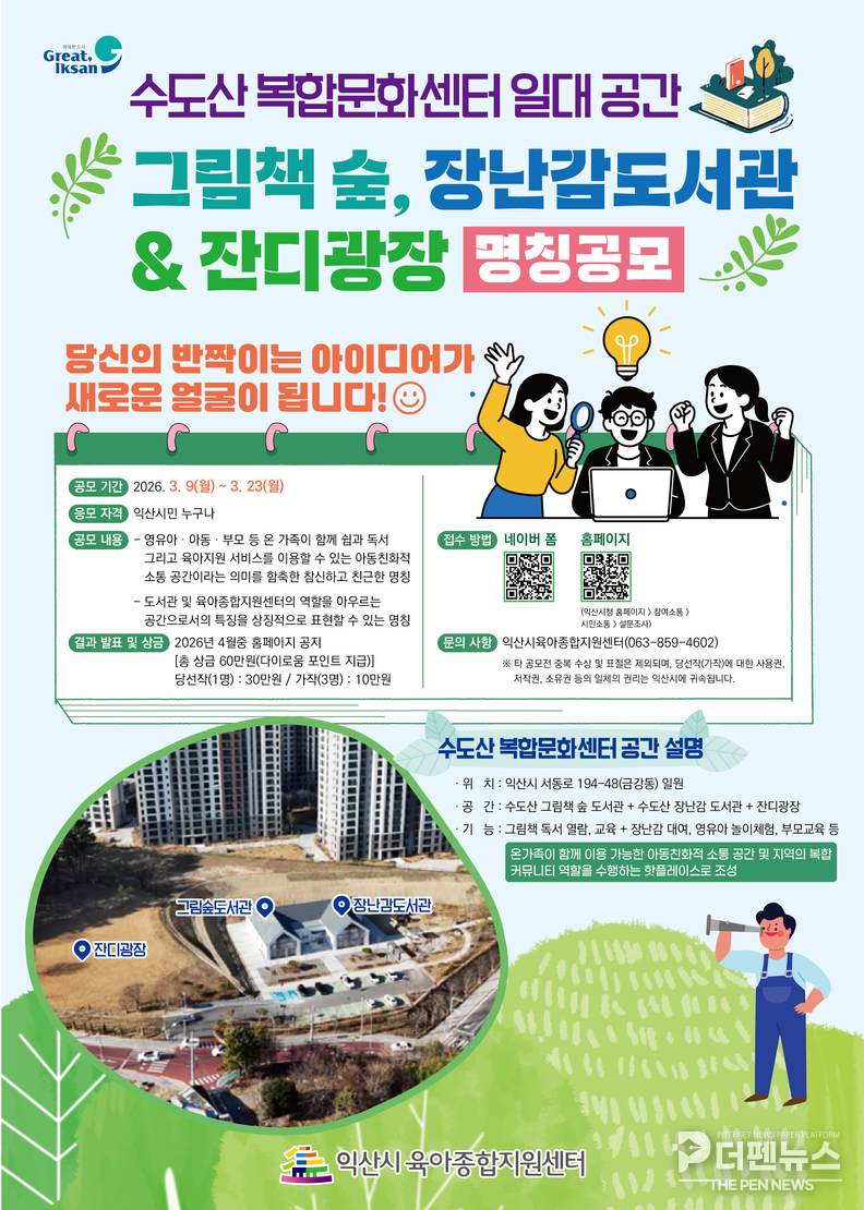 익산시 관계자는 “수도산 복합문화센터 일대는 아이들이 마음껏 뛰어놀고 부모들이 편히 소통할 수 있는 아동친화 정책의 핵심 거점이 될 것”이라며 “시민들의 관심과 애정이 담긴 이름이 선정될 수 있도록 많은 참여를 바란다”고 말했다.