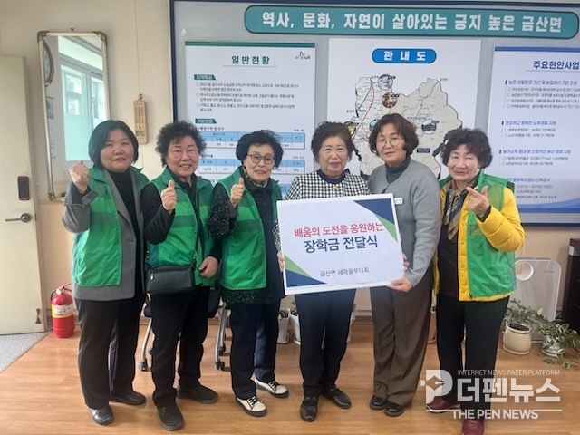 이미정 금산면장은 “지역 인재 육성을 위해 꾸준히 나눔을 실천해 온 새마을부녀회에 감사드린다”며 “앞으로도 교육 사각지대가 발생하지 않도록 살피고 지역과 함께 성장하는 교육 환경 조성에 힘쓰겠다”고 말했다.