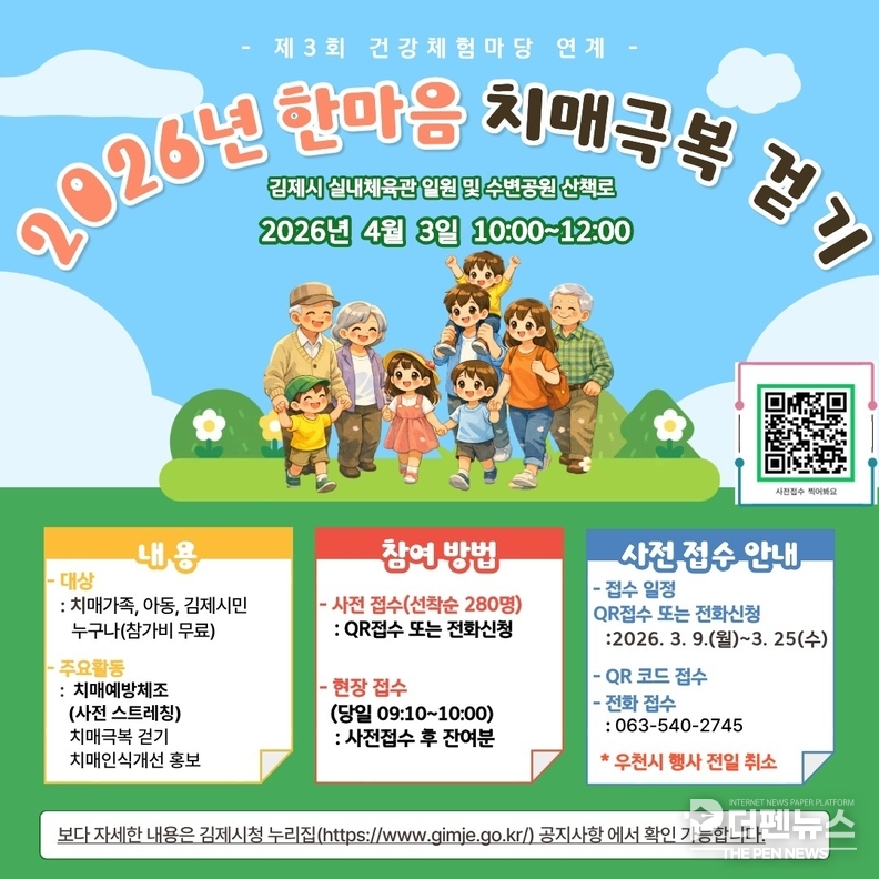 김제시 치매안심센터는 ‘2026 한마음 치매극복 걷기 행사’ 참가자를 모집한다고 밝혔다.