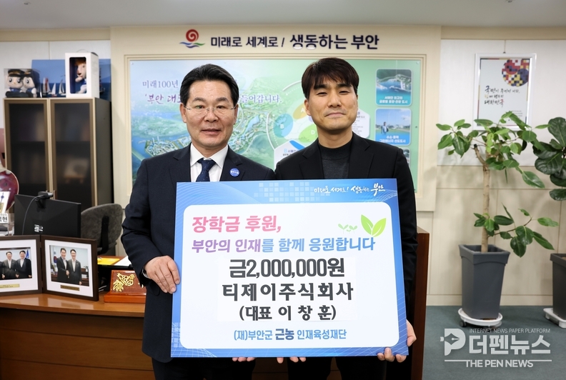 부안군은 티제이주식회사(대표 이창훈)가 근농인재육성재단에 장학금 200만원을 전달했다고 밝혔다.