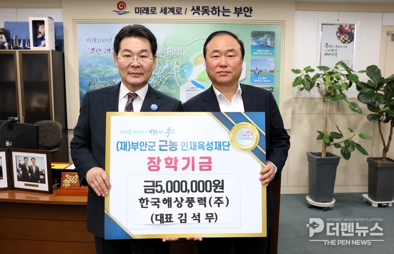 부안군은 한국해상풍력주식회사(대표 김석무)가 부안군 근농인재육성재단에 장학금 500만원을 기탁했다고 밝혔다.