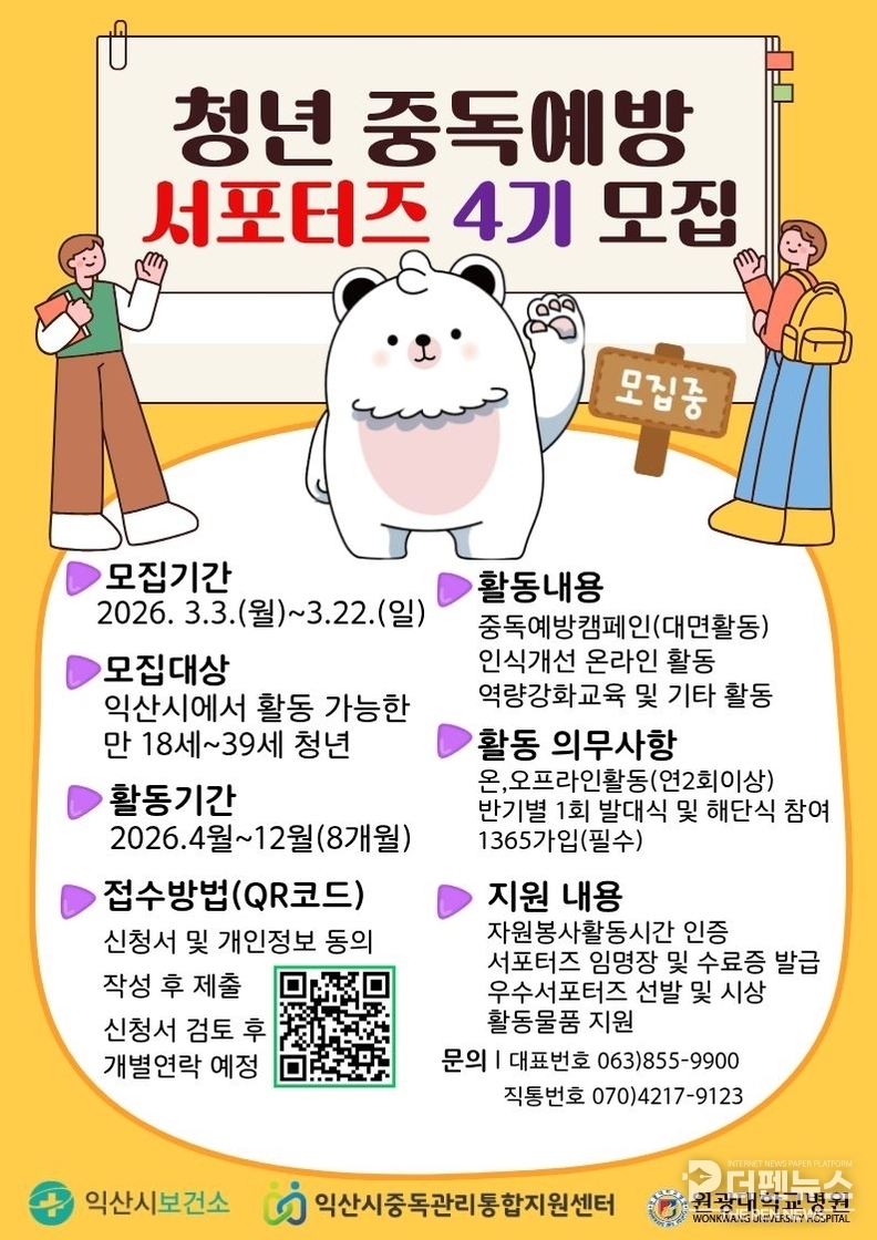 익산시 관계자는 “청년들이 직접 참여하는 서포터즈 활동을 통해 중독 예방에 대한 사회적 관심을 높이고 도움이 필요한 청년들이 적절한 지원을 받을 수 있도록 적극적인 홍보와 지원을 이어가겠다”고 말했다.