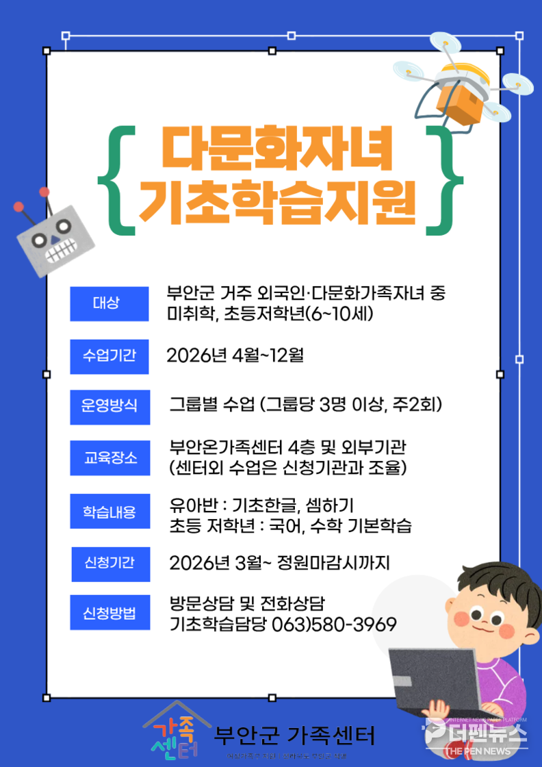 부안군가족센터는 다문화가정 자녀를 대상으로 읽기와 쓰기, 기초 수학 등 기본 학습 능력을 향상시키기 위한 ‘다문화자녀 기초학습 지원 사업’을 추진한다고 밝혔다.