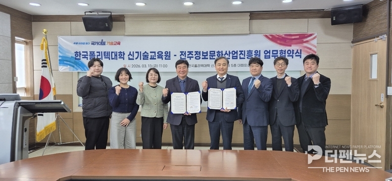 전주정보문화산업진흥원은 13일 한국폴리텍대학 신기술교육원과 가상융합 기술 기반 피지컬AI 실증과 전문 기술 인재 양성을 위한 업무협약을 체결했다고 밝혔다.