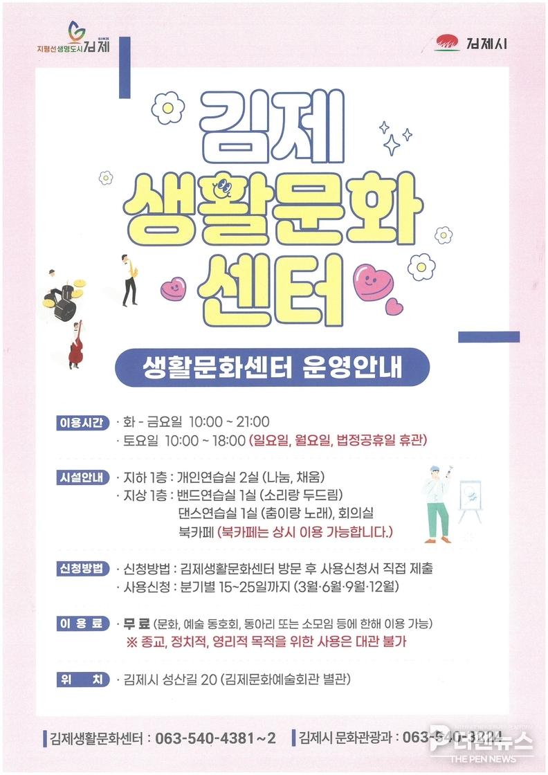 전북 김제시가 시민들의 문화 활동을 지원하기 위해 생활문화 공간을 무료로 개방한다.