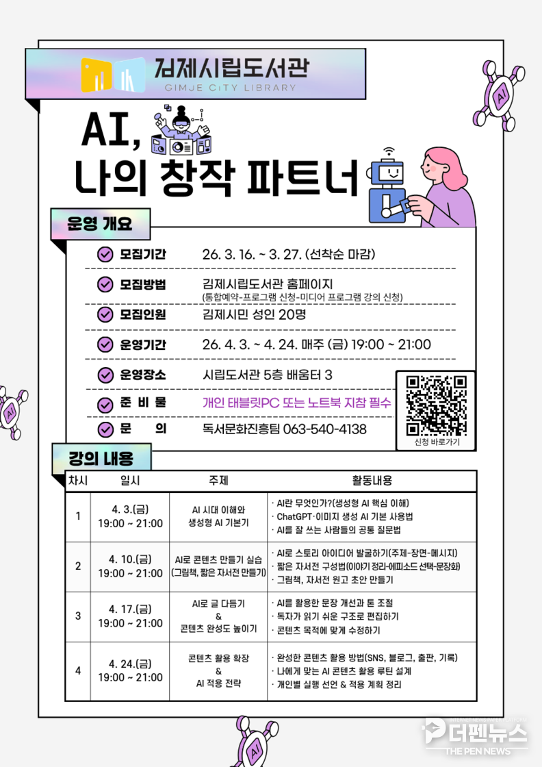 김제시립도서관은 생성형 인공지능(AI)을 활용한 실습형 교육 프로그램 ‘AI, 나의 창작 파트너’를 마련하고 수강생을 모집한다고 밝혔다.
