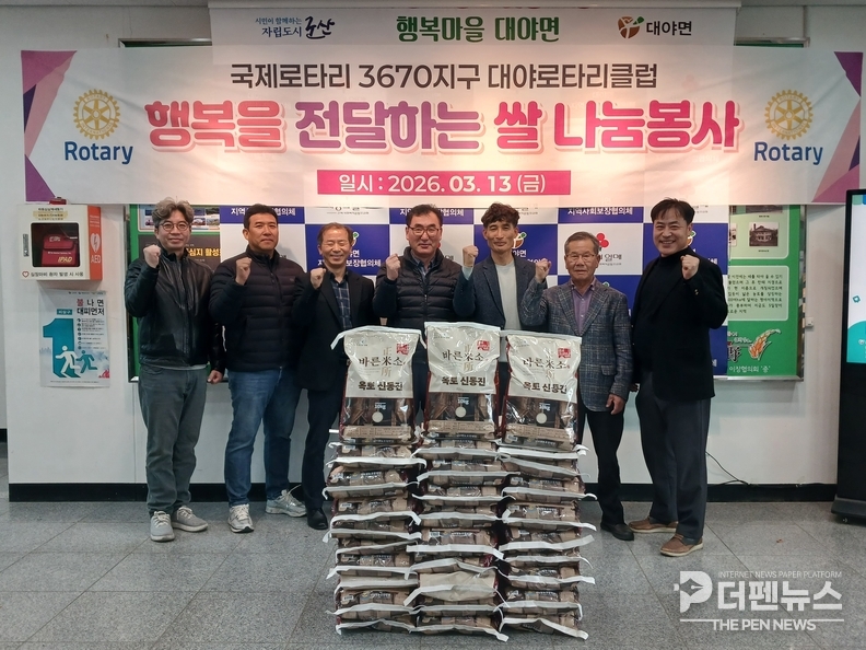 이유청 대야면장은 “지역의 어려운 이웃을 위해 따뜻한 나눔을 실천해 준 로타리클럽 회원들에게 감사드린다”며 “기탁된 쌀은 도움이 필요한 가정에 소중히 전달하겠다”고 밝혔다.