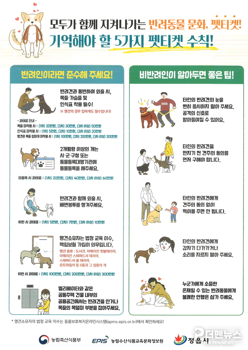 정읍시가 봄철 야외 활동 인구 급증에 발맞춰 반려인과 비반려인 사이의 갈등을 줄이고, 성숙한 반려동물 문화를 정착시키기 위한 ‘펫티켓(Pet+Etiquette)’ 홍보 활동에 본격 나섰다.