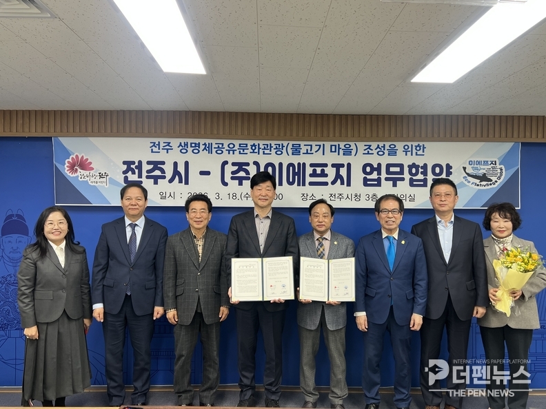 전주시는 18일 시청에서 ㈜이에프지와 ‘생명체 공유 문화관광(물고기마을)’ 사업 추진을 위한 업무협약을 체결했다고 밝혔다. 협약식에는 윤동욱 부시장과 류병덕 대표 등 관계자들이 참석했다.