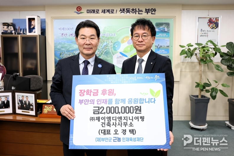 부안군 근농인재육성재단은 건축설계·엔지니어링 기업인 ㈜제이엠디엔지니어링이 장학금 200만 원을 기탁했다고 밝혔다. 해당 기업은 지난해에 이어 올해도 기부를 이어가며 누적 400만 원의 장학금을 전달했다.