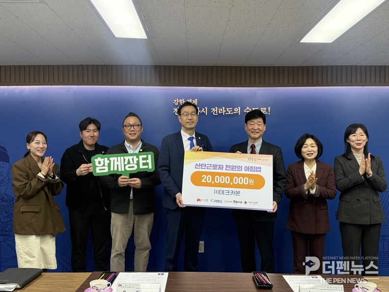 전주시는 ㈜데크카본이 19일 ‘산단 근로자 천원의 아침밥’ 사업 지원을 위해 2000만 원을 기탁했다고 밝혔다. 이날 전달식에는 시 관계자와 기업 관계자 등이 참석했다.