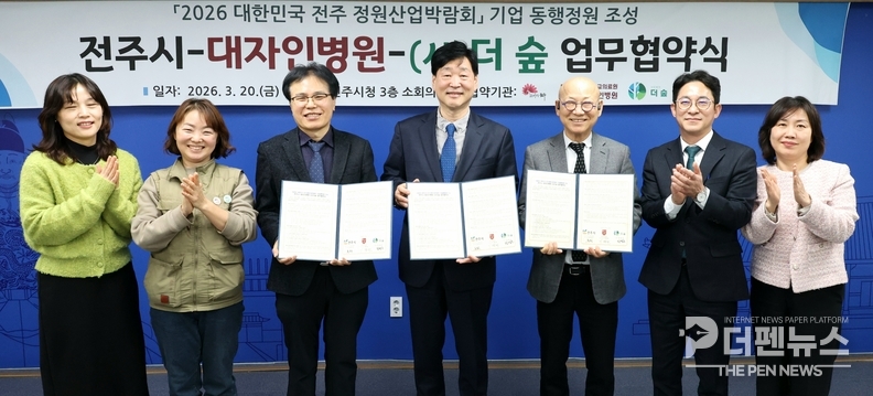 전주시는 20일 대자인병원, 사단법인 더숲과 함께 ‘2026 대한민국 전주정원산업박람회’ 기업동행정원 조성을 위한 업무협약을 체결했다고 밝혔다. 이번 협약에 따라 덕진공원에는 대자인병원의 치유 철학을 담은 기업동행정원이 들어설 예정이다.