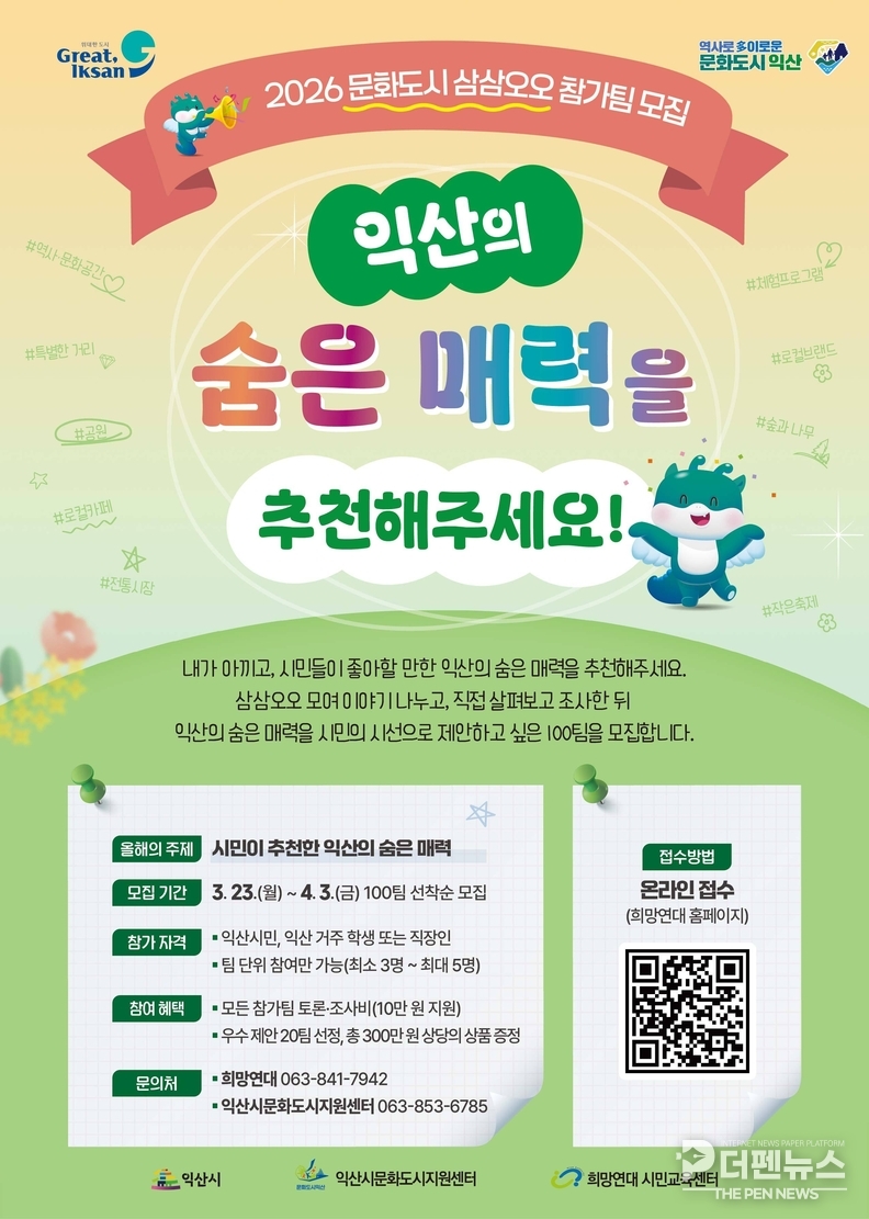 익산시는 문화도시지원센터, 희망연대와 함께 시민 참여 프로그램 ‘2026 문화도시 삼삼오오’ 참가팀을 모집한다고 23일 밝혔다.