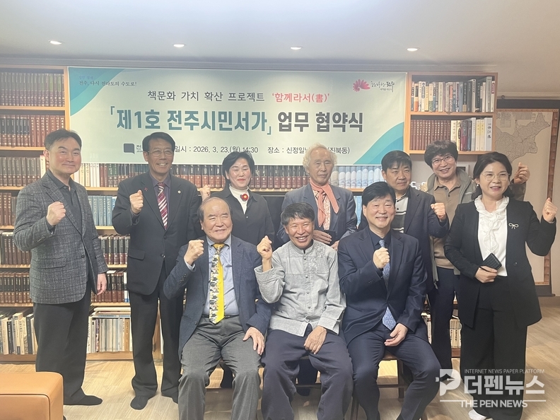전주시는 23일 덕진구 태진로에 있는 신정일 사단법인 우리땅걷기 이사장 자택에서 ‘제1호 전주시민서가’ 지정 업무협약을 체결했다고 밝혔다. 이날 협약식에는 윤동욱 전주시장 권한대행 부시장과 신 이사장, 이형구 전 전주시인협회장 등이 참석했다.