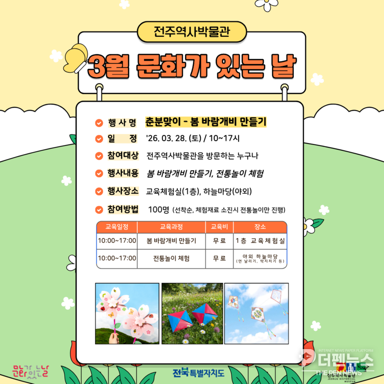 전주역사박물관 관계자는 “춘분맞이 행사가 가족이 함께 봄을 느끼고 즐기는 시간이 되길 바란다”며 “앞으로도 다양한 문화 체험 프로그램을 지속적으로 마련하겠다”고 말했다.