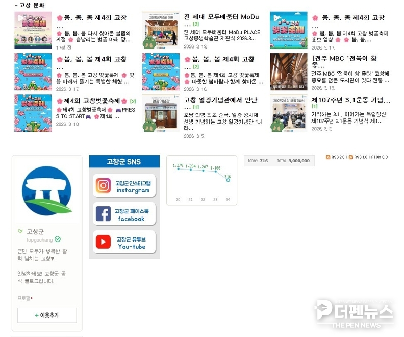 전북 고창군이 운영하는 공식 블로그가 누적 방문자 500만명을 넘어서며 지역 대표 소통 창구로 자리매김하고 있다.