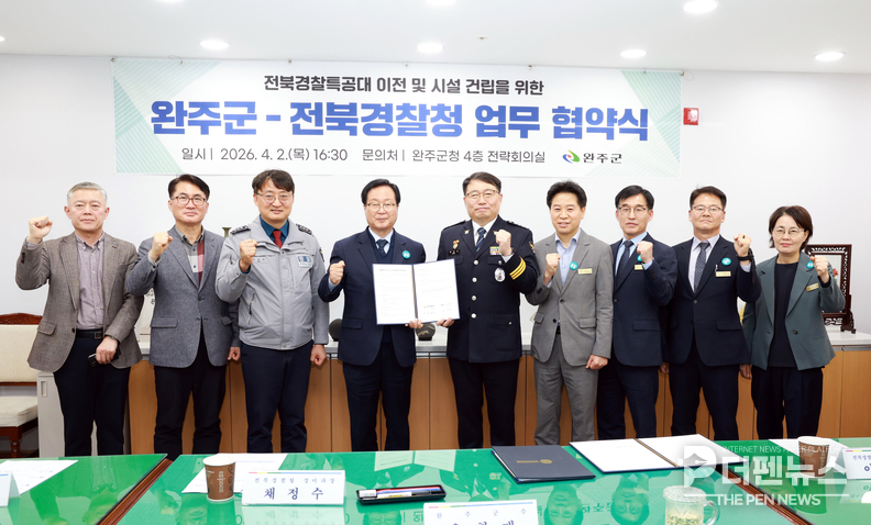 완주군과 전북경찰청은 2일 군청에서 경찰특공대 이전 및 청사 신축을 위한 업무협약을 체결했다고 밝혔다.
