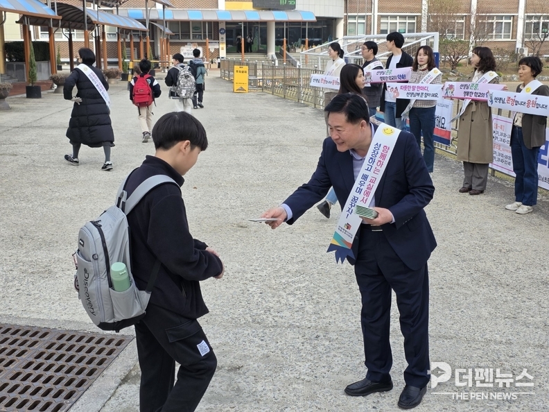 이번 캠페인은 교권 보호에 대한 사회적 경각심을 높이고, 교사들이 자긍심을 갖고 교육에 전념할 수 있는 안심 환경을 구축하기 위해 기획됐다. 캠페인 참가자들은 ‘우리 선생님은 우리가 지켜요’, ‘선생님께 힘이 되는 따뜻한 인사 한마디’ 등 친근한 문구가 담긴 어깨띠를 두르고 학생들에게 홍보물을 나누어 주며 캠페인의 취지를 알렸다.