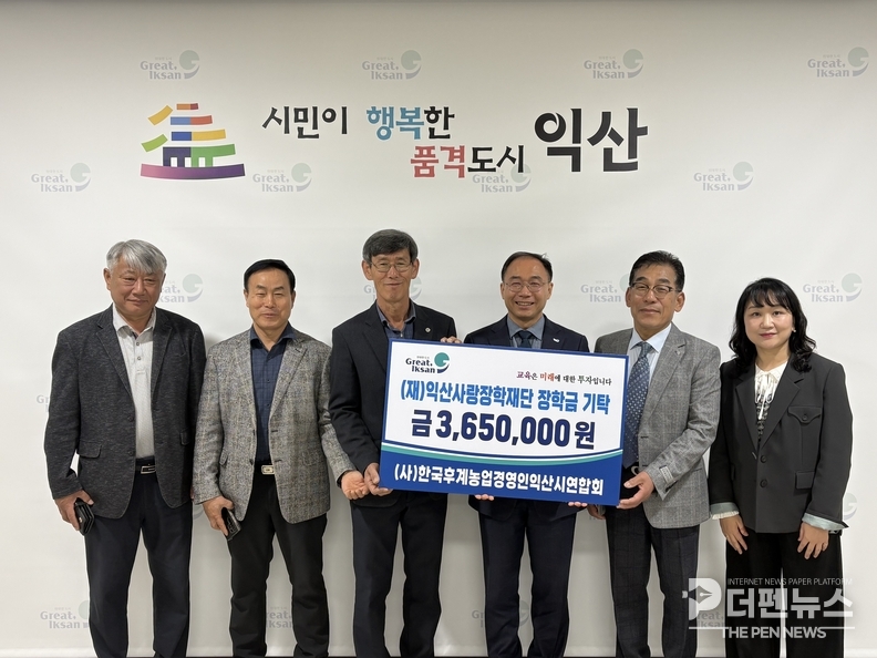 익산시는 한국후계농업경영인익산시연합회가 익산사랑장학재단에 장학금 365만 원을 기탁했다고 밝혔다.