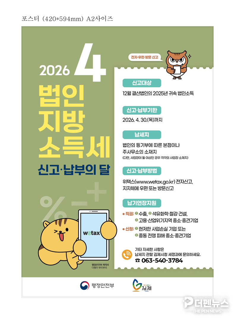 김제시는 2025년 귀속 법인지방소득세 신고·납부 기간을 이달 말까지 운영하며, 관내 법인을 대상으로 집중 안내에 들어갔다. 대상은 지난해 12월 결산 법인으로, 약 2000여 개 사업체가 포함된다.