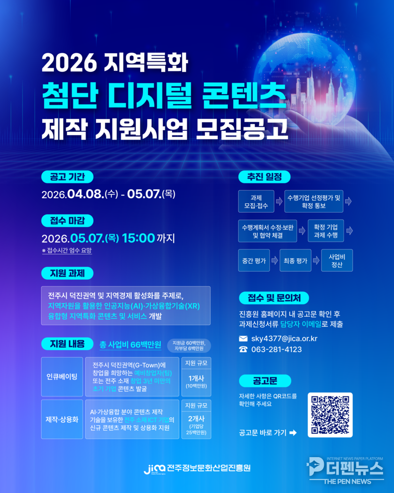 전주시는 전주정보문화산업진흥원이 ‘지역특화 첨단 디지털 콘텐츠 제작 지원 사업’ 참여 기업을 모집한다고 밝혔다.