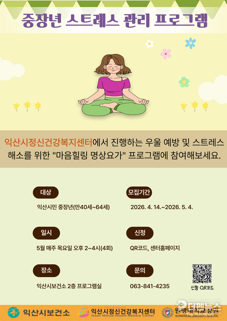 익산시정신건강복지센터는 만 40세부터 64세까지 중장년을 대상으로 ‘마음힐링 명상요가’ 프로그램을 운영한다고 밝혔다.